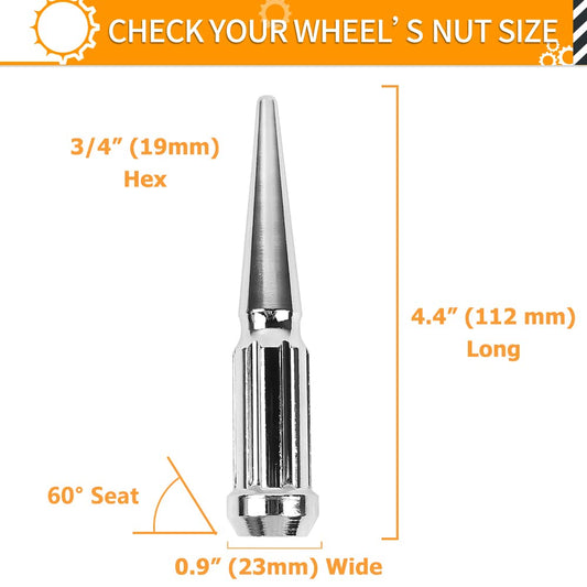 MIKKUPPA M14x1.5 Wheel Spike Lug Nuts, 24pcs Chrome Spike Lug Nuts 14x1.5 Solid 4.4" Tall Acorn Lug Nut with 1 Socket Key Replacement for Chevy Silverado 1500 2500 3500, F-150 F-250 F-350