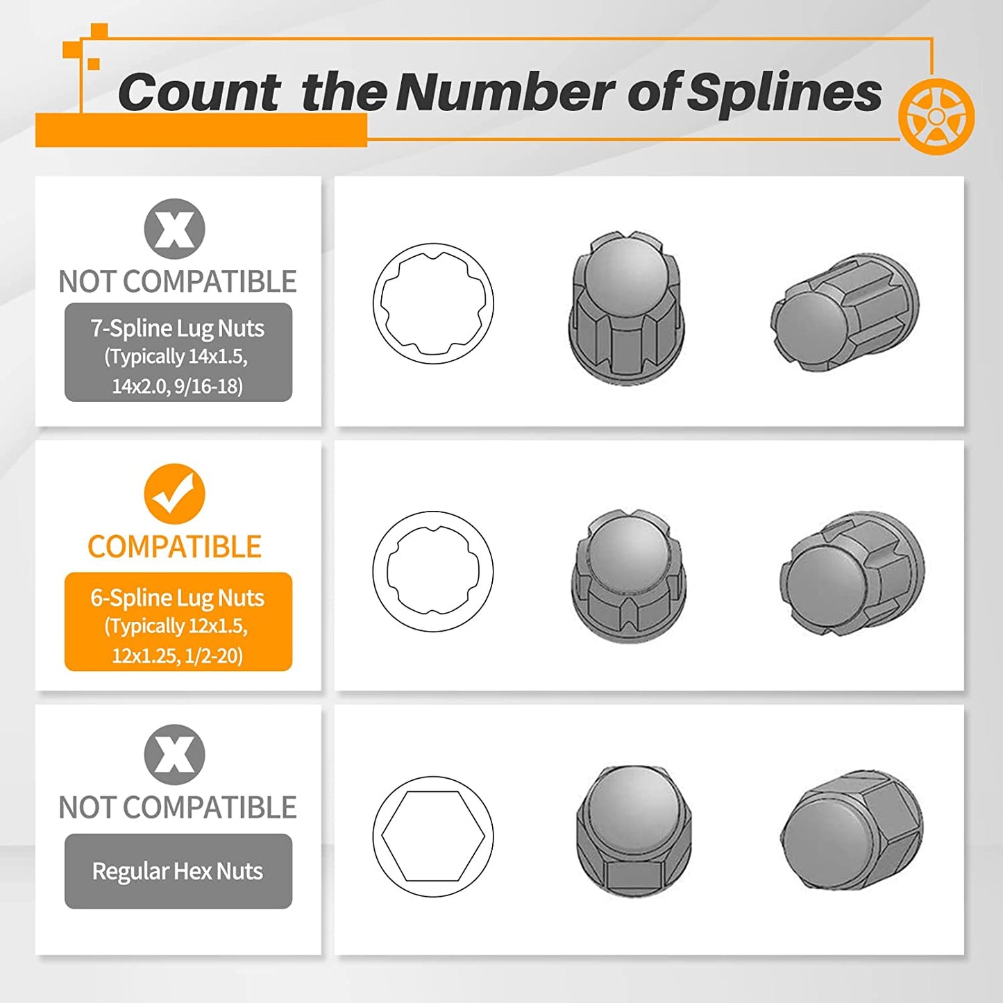 - FITMENT - 2pcs 6 Point Spline Lug Nut Socket Key Tool Compatible with M12x1.5, M12x1.25, 1/2-20 threads spline lug nuts. Or Contact our Customer Service Team to verify a safe and proper fitment. Please note: This 6-spline socket key is only compatible with 19mm, 3/4", 21mm, 13/16". It is recommended that you check the user manual to understand the required spacification of the nuts socket.