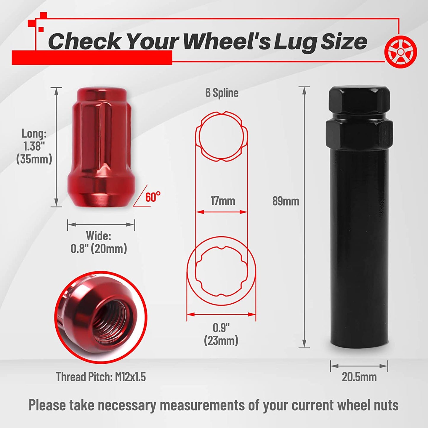 - 🚗 M12x1.5 thread - closed end bulge style lug nuts - conical 60 degree seat - 19mm hex - 1.38 in. long - color: red. MIKKUPPA spline nut adopts the third-generation anti-corrosion technology and forging technology, and the precision-machined threads and bolts fit perfectly to ensure safe driving.