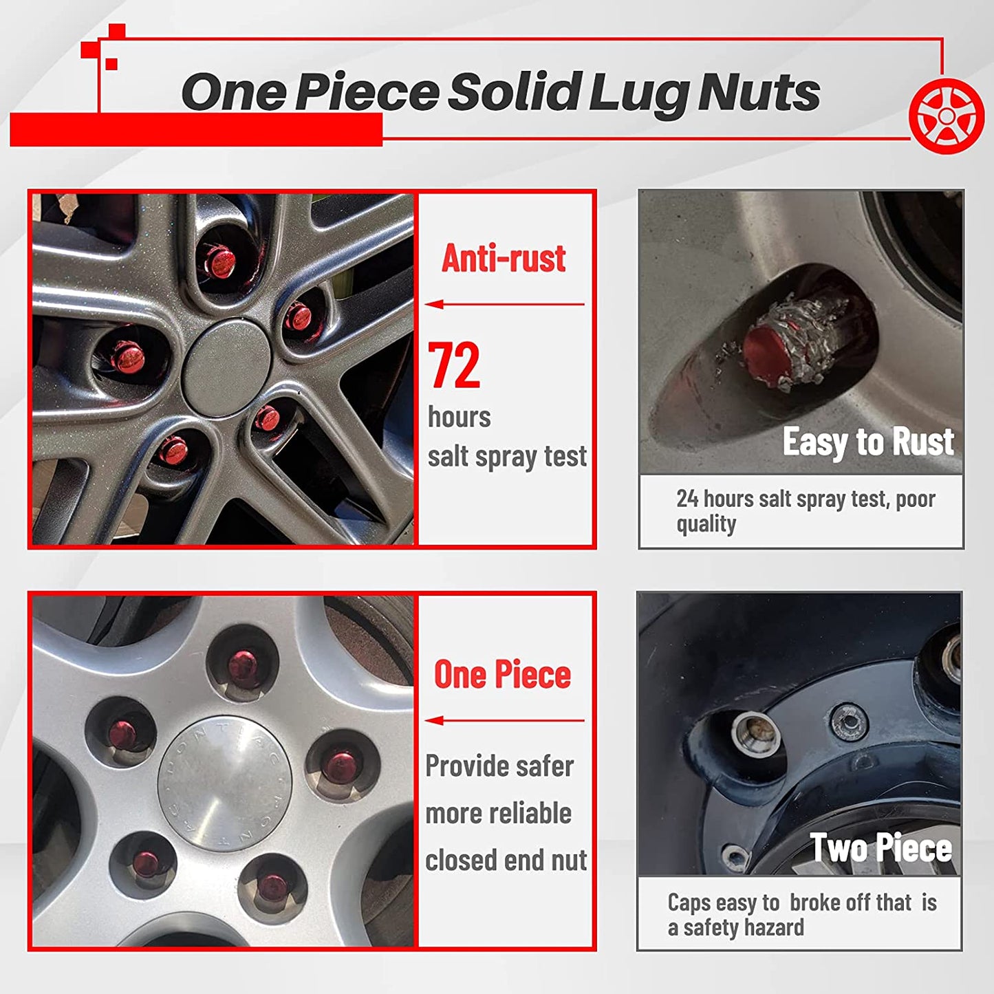 - 🚗 One-piece spline lug nuts design provides a safer and more reliable closed end nut than any other on the market. One-piece design compared with other two-piece design, Anti-cracking off and make it aesthetically pleasing while ensuring safe driving.Buy with confidence and enjoy the fun of safe driving!